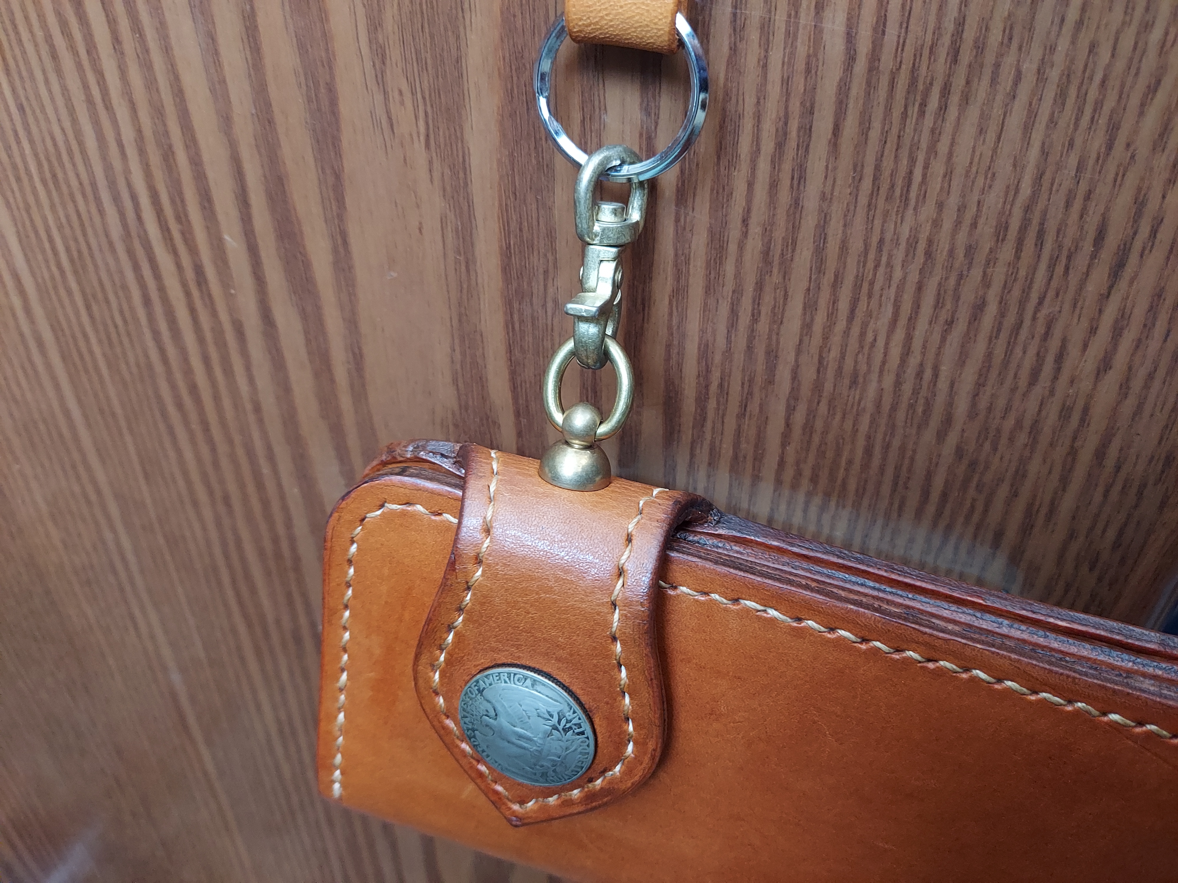取り付け簡単です。6㎜のポンチとマイナスドライバーがあれば誰でも簡単に取り付けられます。私の場合はバイカーウォレットに取り付けたら良い感じになり、とても気に入っています。